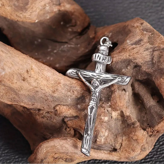 Men Cross Necklace Silver Jesus Crucifix INRI Cross Pendant for Women with 24" Chain Stainless Steel Christmas Day Gift